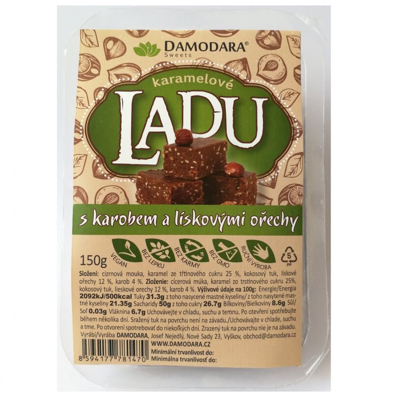 cizrnová mouka, karamel ze třtinového cukru 25 %, kokosový tuk, lískové ořechy 12 %, karob 4 %