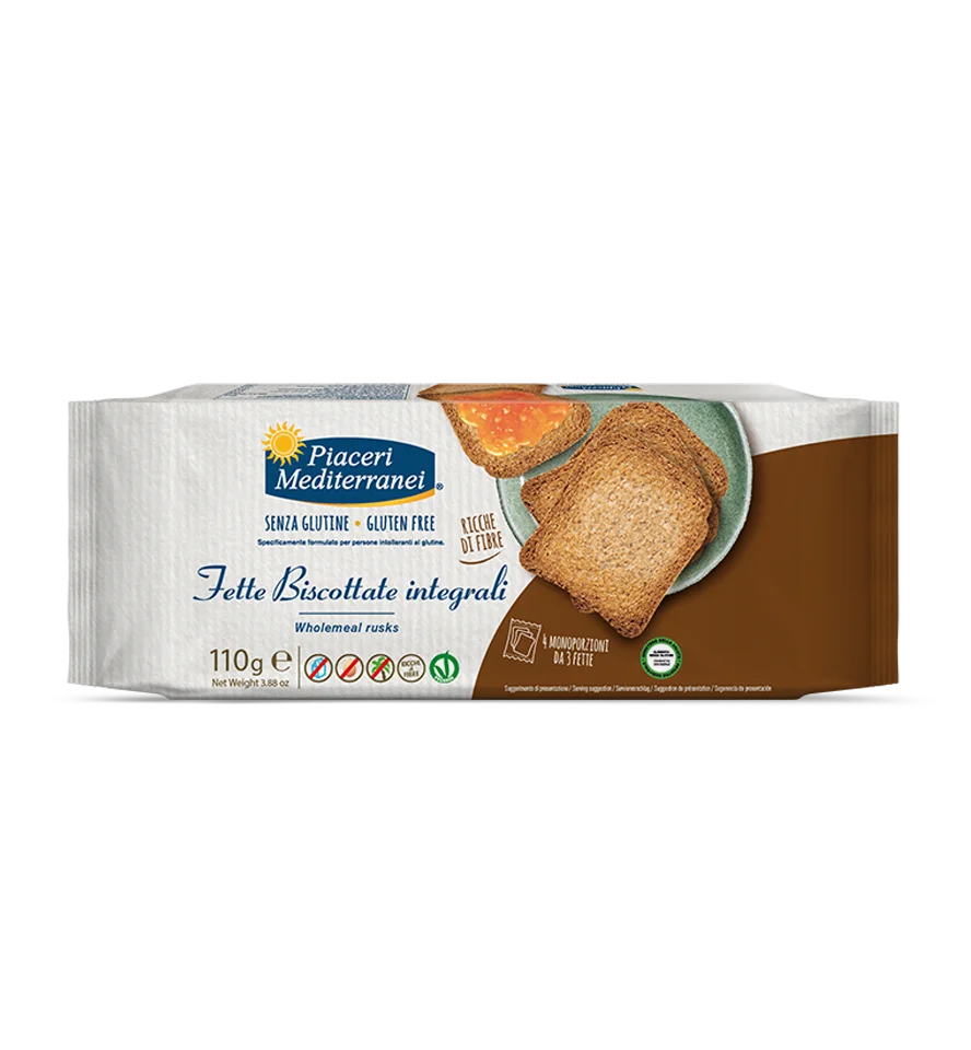 Fette Biscottate Integrali od Piaceri Mediterranei jsou křupavé celozrnné bezlepkové křupavé chlebíky (topinky), které kombinují chuť a výživu. Obsahují celozrnnou rýžovou a pohankovou mouku, což zajišťuje vysoký obsah vlákniny a příjemnou texturu. Díky praktickému balení po třech plátcích jsou ideální na cesty nebo do práce.