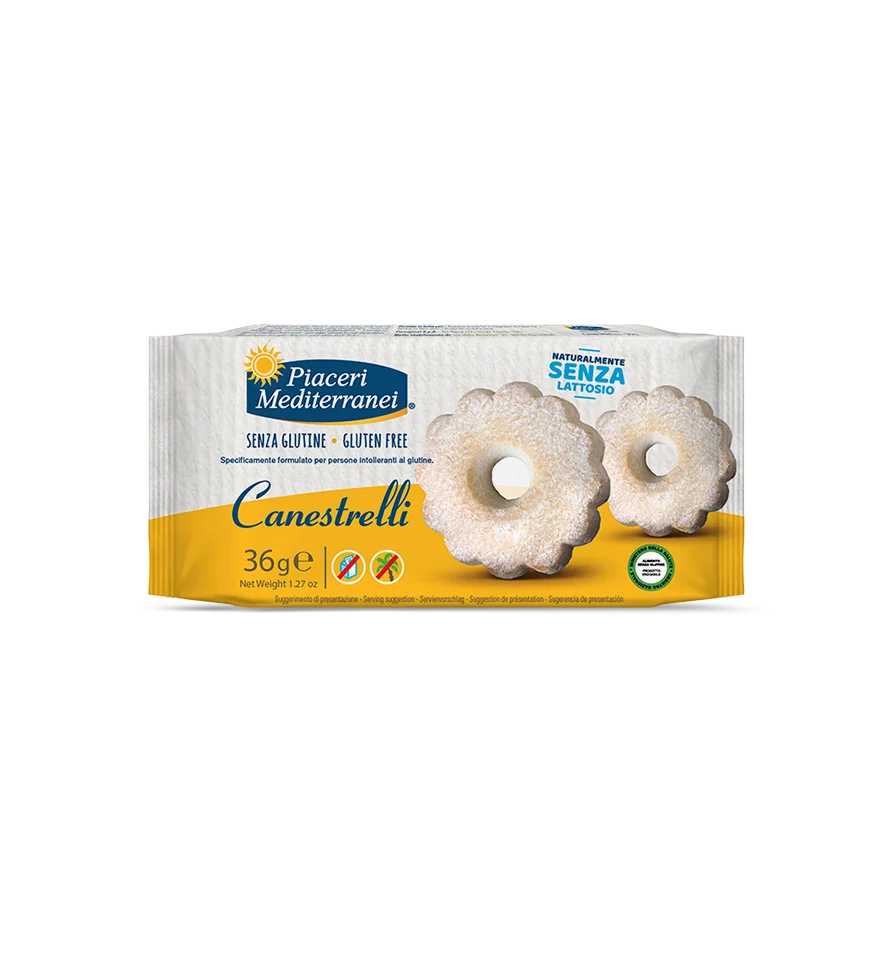 Canestrelli Monoporzione od Piaceri Mediterranei jsou tradiční italské květinové sušenky v moderním bezlepkovém provedení. Vyrobené z kukuřičného škrobu, bramborové mouky a rýžové mouky, nabízejí lehké, ale výrazně máslové těsto.