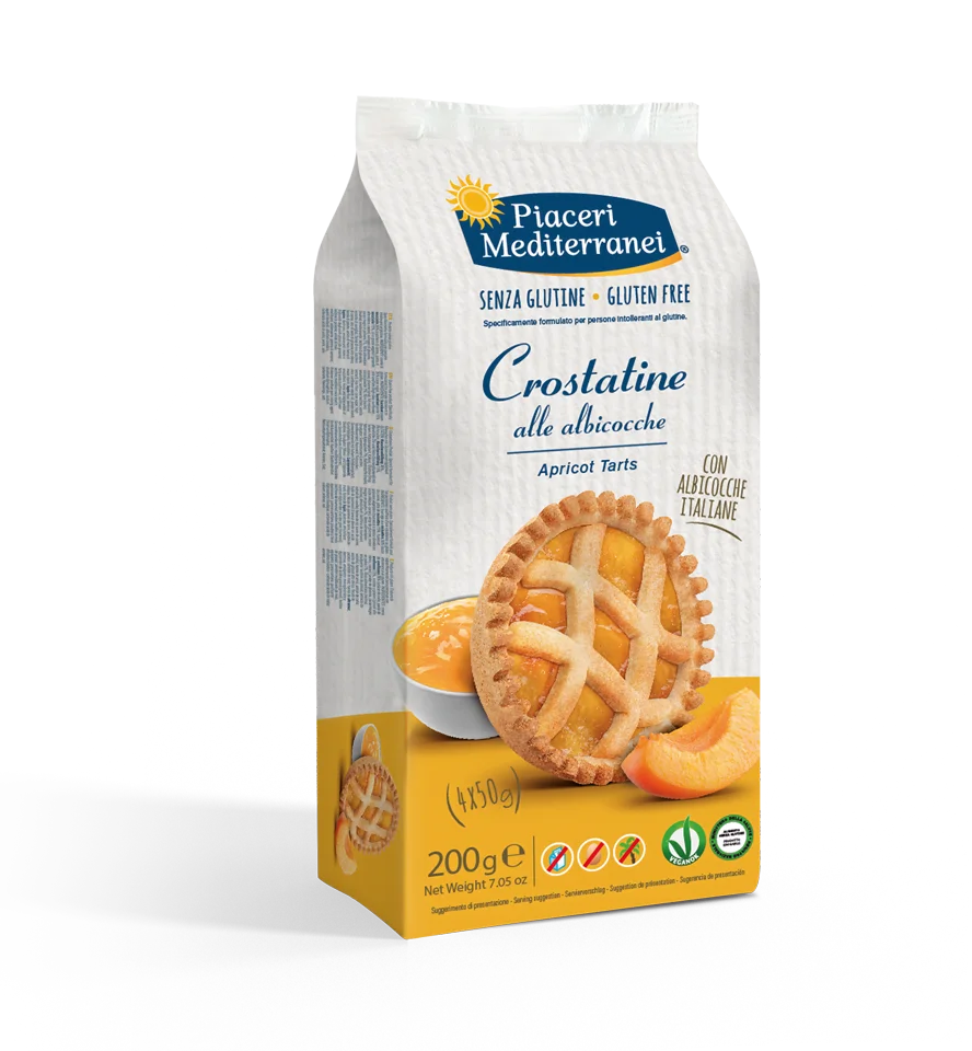 Bezlepkové meruňkové Crostatine od Piaceri Mediterranei – to jsou lahodné a křehké koláčky plné ovocné chuti.Tyto křehké dezerty jsou vyrobeny z kvalitních surovin, neobsahují lepek, mléko ani vejce, jsou tak vhodné i pro vegany. S 36% podílem italských meruněk nabízí přirozeně sladkou chuť bez palmového oleje. Ideální ke kávě, snídani či jako svačina na cesty.