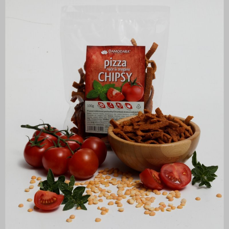 PIZZA chipsy – Luštěninové lupínky s rajčetem a oregánem. Podává se jako pochutina (křupky či brambůrky).